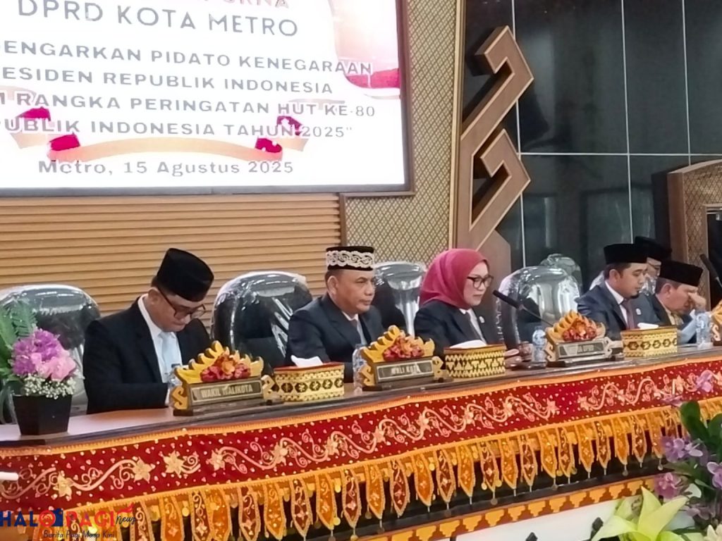 Metro – DPRD Kota Metro bersama Pemerintah Daerah Kota Metro menggelar Rapat Paripurna di Gedung Paripurna DPRD Kota Metro, untuk mengikuti Sidang Tahunan MPR RI secara daring, Jumat (15/8/2025).